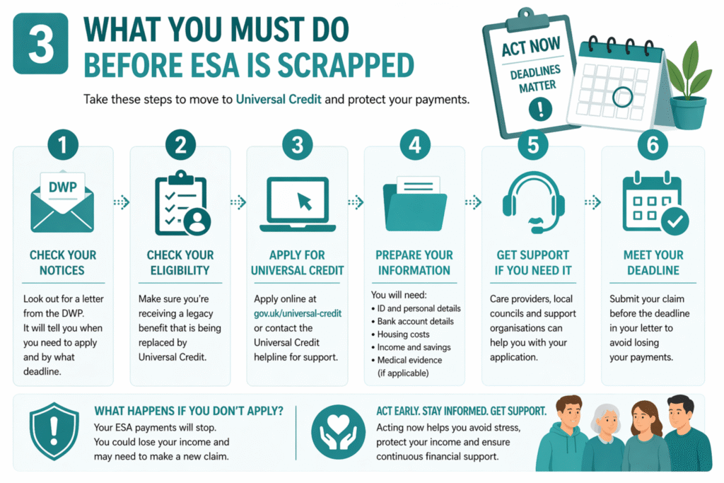 If you or someone you support still receives ESA, you must act now. The DWP will not move you automatically. You must apply for Universal Credit before your deadline to keep receiving financial support.