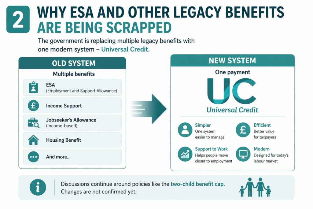 The DWP is scrapping ESA and other legacy benefits to replace them with a single system: Universal Credit. This move forms a key part of the wider DWP benefit scrapping programme aimed at simplifying welfare and encouraging people to move closer to work where possible.