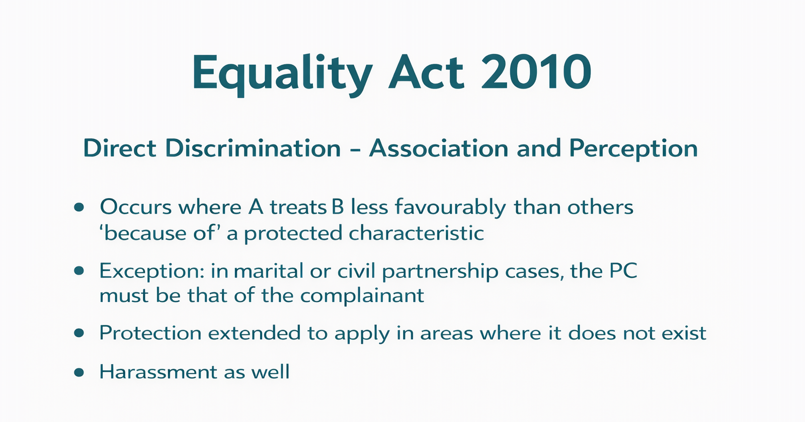 The Equality Act also protects people in situations where discrimination happens indirectly through assumptions or relationships. Two important legal concepts are discrimination by association and discrimination by perception.