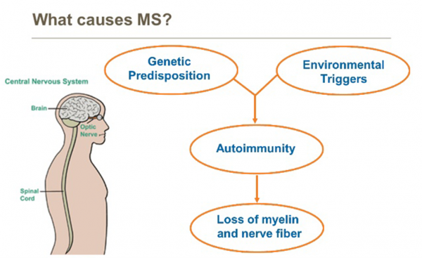 For caregivers, the most important takeaway is this: MS develops from a complex interaction between genes and environment, not from one single inherited cause.