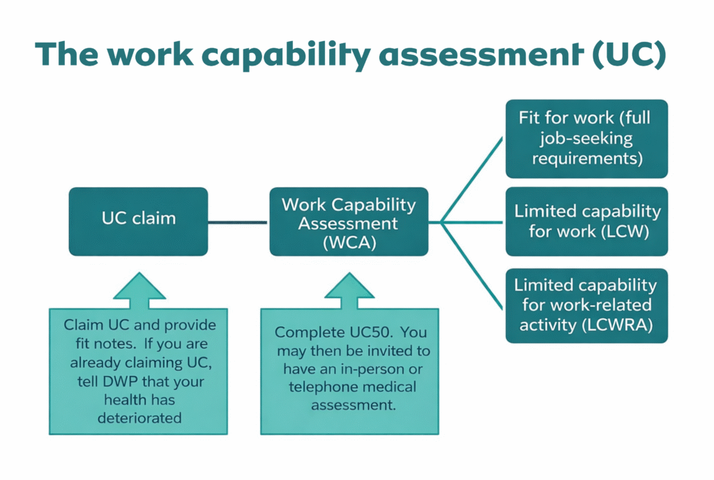 The work capability assessment is a UK government evaluation used by the Department for Work and Pensions (DWP) to determine how a health condition or disability affects a person’s ability to work when claiming Universal Credit or Employment and Support Allowance (ESA).